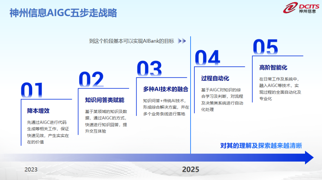 EVO视讯官网信息制定了 AIGC 五步走战略,并为此制定了开展路径图:以降本增效为起点,到多种AI技术的融合基本可以实现AI Bank的目标,最终达到高阶智能化和专业化的开展路径。